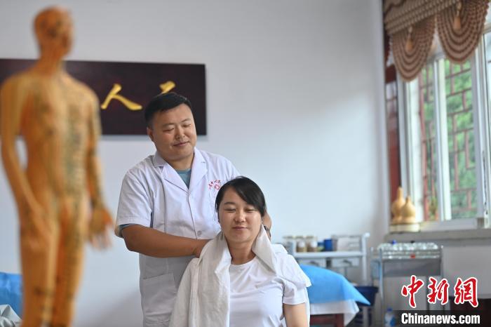 7月16日,甘肅省平涼市靈臺縣皇甫謐針灸康養館內,工作人員對患者進行推拿治療。2006年,靈臺皇甫謐針灸術入選第一批甘肅省非物質文化遺產名錄。靈臺作為皇甫謐故里,當地民眾非常認可中醫康養,針灸、拔火罐、推拿、葫蘆灸、火龍灸(督脈灸)等中醫特色療法受到了很多人的青睞,當地官方也通過舉辦大型節會等助推中醫康養產業發展。 皇甫謐是針灸醫學鼻祖,其《針灸甲乙經》已在多個國家被廣泛傳播應用。  中新社記者 李亞龍 攝
