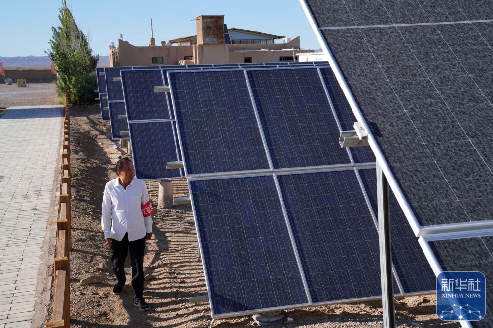 ↑7月16日,張吉全檢查屋后的太陽能電池板。