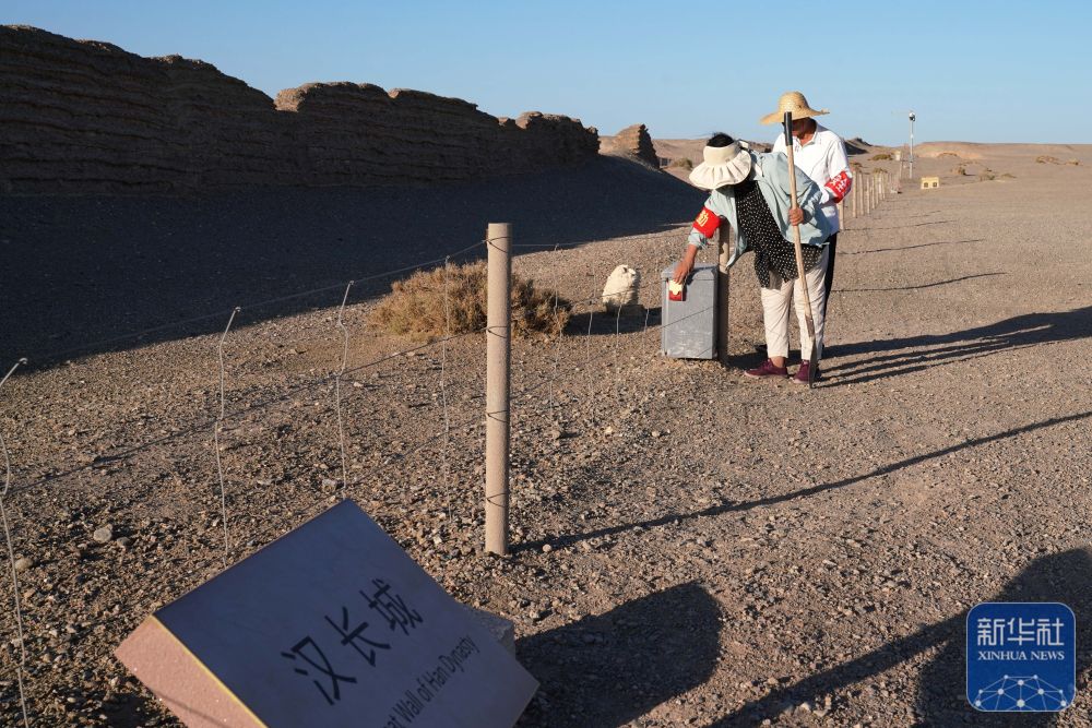 ↑7月16日,張吉全和聞春瑜夫婦沿著漢長城巡護時加固防護欄。