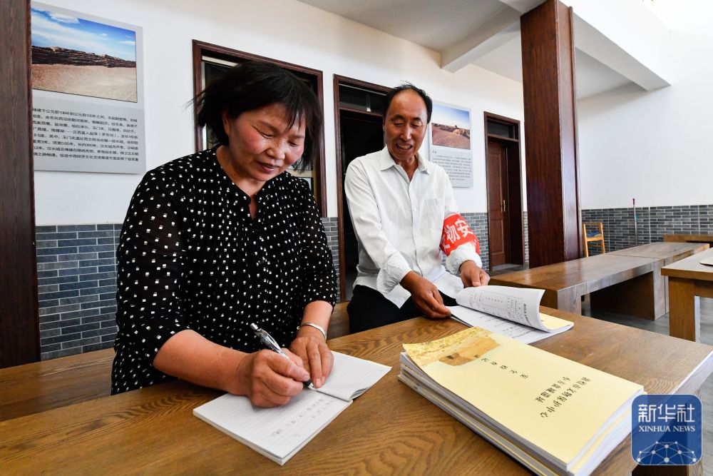 ↑7月16日,張吉全和聞春瑜在漢長城文物保護管理用房內寫巡護日記。