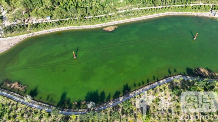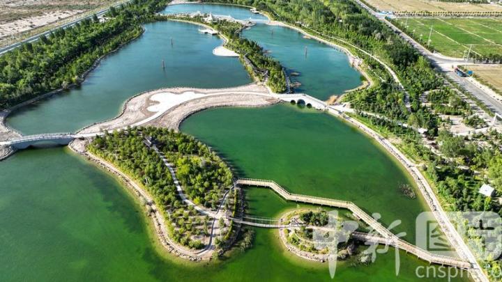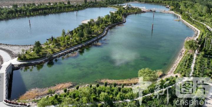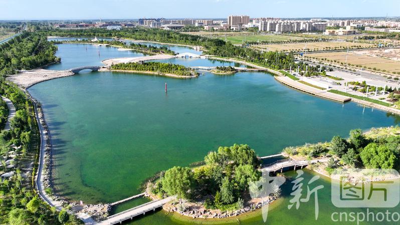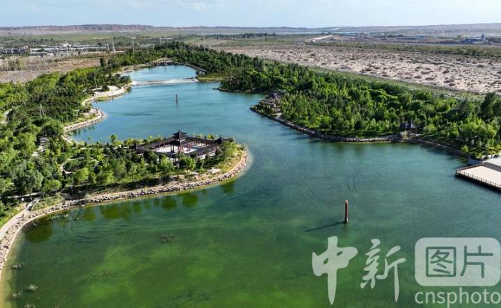 2024年7月27日,航拍甘肅省酒泉市金塔縣城西生態湖,綠意盎然,生機勃勃,構成了“戈壁水鄉”的獨特畫卷。 中新社發 曹紅祖 攝