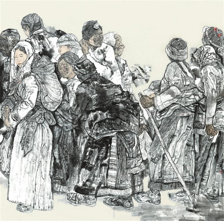 作品《趕集》主要描繪了不同年齡階段的人物聚集一起趕集的一幕,以筆墨求真的態度,通過不同的形象去表現人物的真善美。在落墨前,我對人物造型和畫面形式結構反復推敲打磨,力求作品更有溫度和厚度。