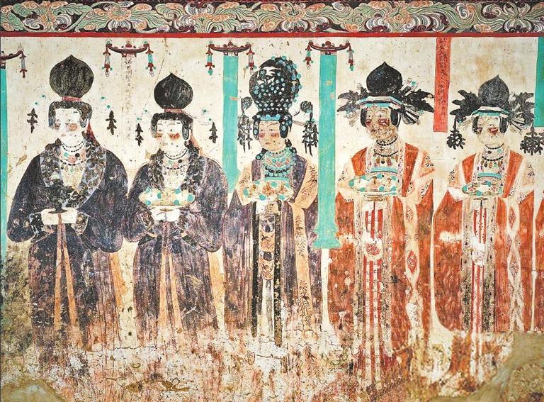 曹氏歸義軍第一任節度使曹議金積極開展和親外交,同甘州回鶻和于闐締結姻親關系,迎娶甘州回鶻公主和于闐國王女兒的同時,又將自己的女兒嫁給回鶻圣天可汗和于闐國王。在公元914年到公元935年之間建了第98窟。該窟一大特色是供養人畫像,共計200多身。曹議金打破了功德窟一般只繪制自家親屬畫像的常規,把歸義軍文臣武將、僧官大德也都容納進來,不可不說曹議金用心良苦,這是他鞏固曹氏政權的一個重要舉措。第61窟完成于公元947年—公元951年間,功德主為曹氏歸義軍第四任節度使、曹議金之子曹元忠,敦煌研究院所藏寫卷《臘八燃燈分配窟龕名數》稱之為“文殊堂”。該窟東壁門南北兩側繪制女性供養人,其中東壁窟門南側繪制第一、二、三身供養像榜題分別為“故母北方大回鶻國圣天的子敕授秦國天公主隴西李……”“姉甘州圣天可汗天公主一心供養”“姉大朝大于闐國大政大明天冊全封至孝皇帝天皇后一心供養”;東壁窟門北側第四、五、六身供養人題記分別為“外甥甘州圣天可汗的子天公主……”“外甥甘州圣天可汗的子天公主供養”“外甥甘州圣天可汗的子天公主供養”,曹元忠之子曹延祿又迎娶于闐國王之女,所以第七身供養人畫像榜題為“大朝大于闐國天冊皇帝弟三女天公主李氏為新受太傅曹延祿姬供養”。就是通過這種姻親關系,孤懸邊地的歸義軍政權前后維持了百余年的時間。也正是通過這種方式,以歸義軍政權上層為代表的敦煌大族之間同休共戚,不斷融合。