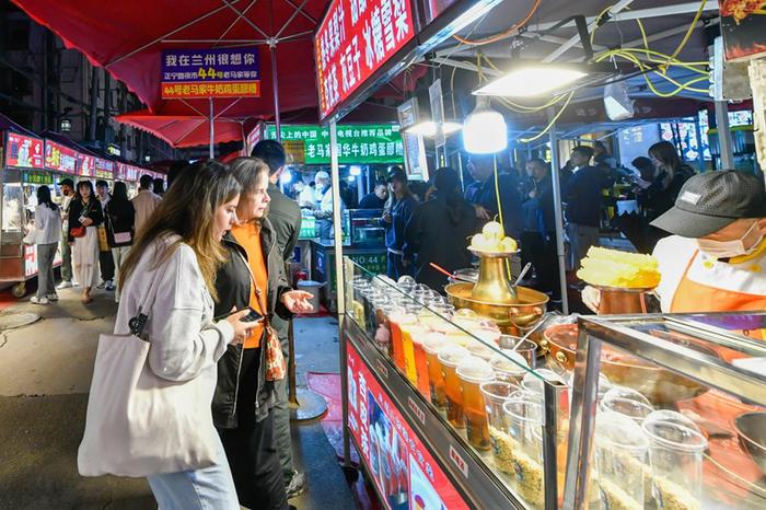 游客在蘭州市城關區正寧路小吃夜市選購特色美食。新華社記者 郎兵兵 攝