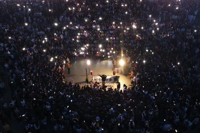 在蘭州市城關區的黃河蘭州段近水平臺,市民及游客參與“蘭州黃河大合唱”活動。新華社記者 范培珅 攝