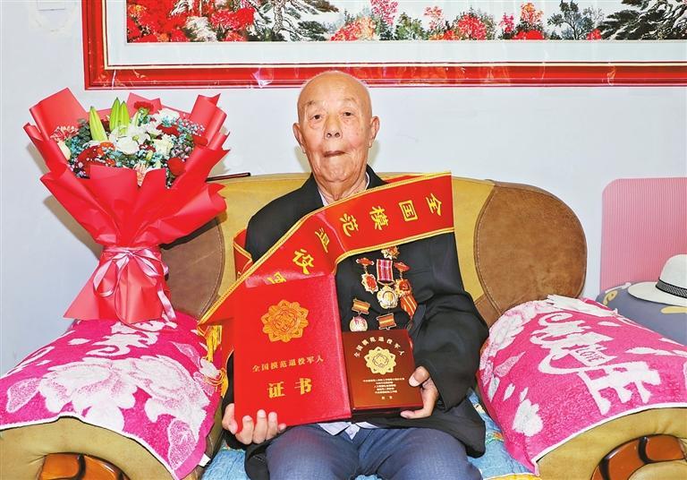 當天,平川區武裝部、退役軍人事務局的工作人員為胡占學帶來了“全國模范退役軍人”榮譽證書、勛章和綬帶,并為老人佩戴了勛章。