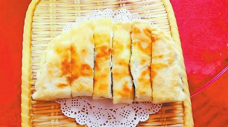 烙饃的面須是醒好的白面,而且要多揉一會兒,越揉越勁道,烙出來的饃,也越有嚼勁。只見母親先將揉好的面棒,切成一段一段的面節(jié)子,而后搟成小面碗樣大的圓餅,對折后把麻腐餡兒均勻地抹在下半扇上,另半扇蓋上去,壓邊,捏花,一個麻腐盒子饃便做成了。