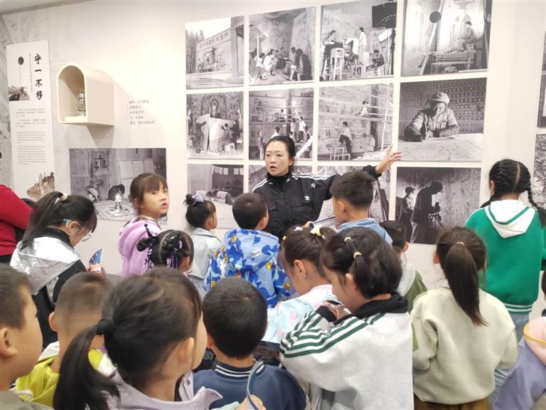為了使小朋友們能夠身臨其境感受敦煌文化的魅力,主持人還為每一位小朋友發放了一本“敦煌小畫師”的研學手冊,并帶領大家前往蘭州市圖書館“近鄰”——敦煌藝術館進行了一場藝術研學之旅。在敦煌藝術館內,孩子們見證了第220號石窟的壯觀,欣賞了館內200余件文化展品,追溯了莫高窟的歷史淵源,了解了壁畫繪制和建筑元素的藝術審美,學習了“壁上丹青”的顏料密碼。