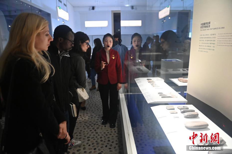 10月22日,2024青年漢學家研修計劃甘肅班團隊22個國家的青年漢學家,走進甘肅省天水市秦安縣大地灣遺址參觀并進行專題研修。大地灣遺址是新石器時代大型聚落遺址,出土了中國乃至世界上最早的彩陶文化、最早的文字符號、種植生產了中國第一批糧食品種黍、出現(xiàn)了最早的宮殿式建筑、發(fā)明了世界最早的水泥地面、創(chuàng)造了最早的繪畫作品——F411地畫。圖為大地灣博物館講解員介紹大地灣遺址出土之最。中新社記者 李亞龍 攝