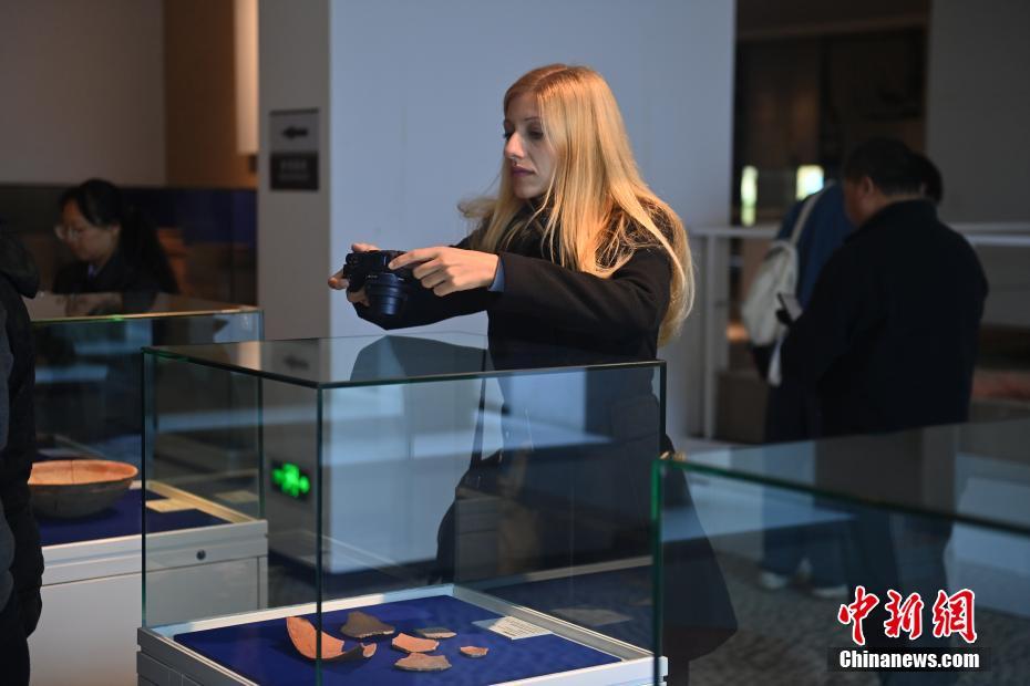 10月22日,2024青年漢學家研修計劃甘肅班團隊22個國家的青年漢學家,走進甘肅省天水市秦安縣大地灣遺址參觀并進行專題研修。大地灣遺址是新石器時代大型聚落遺址,出土了中國乃至世界上最早的彩陶文化、最早的文字符號、種植生產了中國第一批糧食品種黍、出現(xiàn)了最早的宮殿式建筑、發(fā)明了世界最早的水泥地面、創(chuàng)造了最早的繪畫作品——F411地畫。圖為國外青年漢學家拍攝大地灣博物館藏品。中新社記者 李亞龍 攝