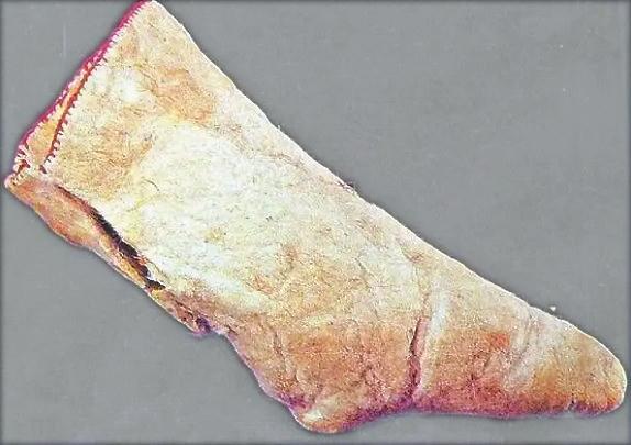 現代考古發現已證實,早期人們穿的襪子確為皮襪。目前存世較早的一雙襪子是公元前九世紀的皮氈(zhān)襪,出土于新疆塔里木盆地南緣扎洪魯克古墓中。