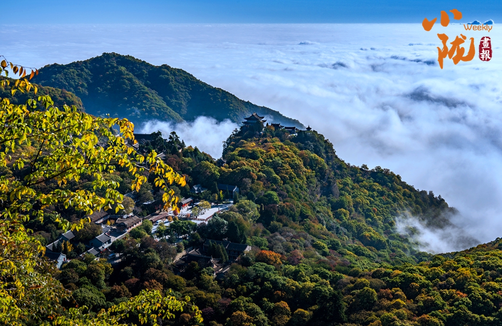 一葉知冬,遍地金黃。五彩斑斕的林木與古香古色的建筑、遠(yuǎn)處的山巒云霧相映成趣,盡顯詩(shī)意之美。