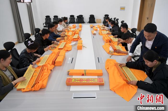2月27日,在甘肅甘南藏族自治州碌曲縣益西達(dá)吉科技有限公司內(nèi),工作人員正在進(jìn)行藏文古籍?dāng)?shù)字化相關(guān)工作。該公司主要從事民族古籍?dāng)?shù)字化建設(shè)和古籍文獻(xiàn)數(shù)據(jù)庫(kù)建設(shè),自2019年以來(lái),承擔(dān)西藏、四川、甘肅等省區(qū)的藏文古籍?dāng)?shù)字化項(xiàng)目。圖為工作人員對(duì)藏文古籍(木刻版)做數(shù)字化工作前期準(zhǔn)備。中新社記者 九美旦增 攝