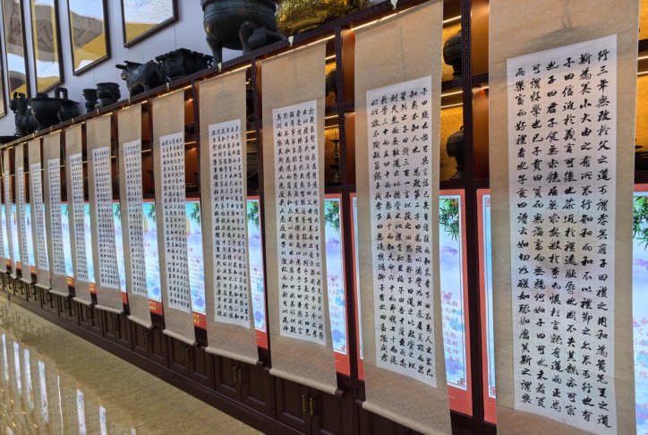 82歲的張文軒是蘭州大學(xué)資深教授,原中文系系主任。現(xiàn)任甘肅省人民政府文史研究館館員、甘肅省教育咨詢委員會委員、甘肅省隴文化研究會名譽(yù)會長等職務(wù)。他長期從事漢語言文字學(xué)的教學(xué)與研究工作,專長音韻方言研究及古詩文寫作,對傳統(tǒng)文化鉆研頗深,擅長書法。他歷時(shí)半年,精心書寫103屏孔子《論語》,并在活動現(xiàn)場將作品捐贈給龍王池文化樂園。