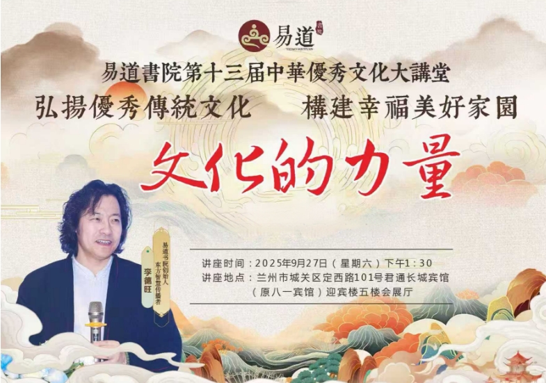 響應時代號召,弘揚傳統文化,旨在文化賦能行業發展,易道書院第十三屆中華優秀文化大講堂將于9月27日在蘭州君通長城賓館(原八一賓館)迎賓樓五樓會展廳開講,誠邀有志之士共襄盛舉,學習傳統文化,賦能行業文明,構建美好家園!