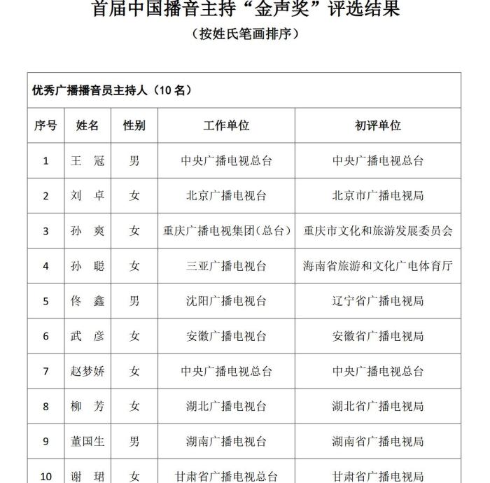 《通知》指出,根據《國家廣播電視總局辦公廳關于組織參加中國廣播電視節目獎•首屆中國播音主持“金聲獎”評選工作的通知》(廣電辦發〔2021〕277號),經過初評、復評和終評,評選出優秀廣播播音員主持人、優秀電視播音員主持人各10名。現將評選結果予以公示,公示期為5個工作日。