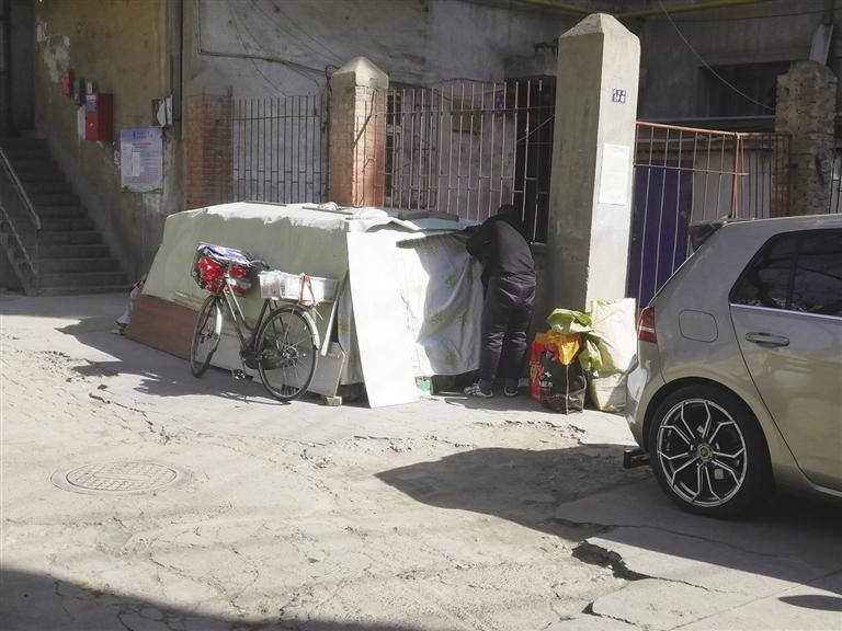 隨后,記者來到閔家橋59號,破舊的小區(qū)內(nèi)堆積的雜物很多,有人堆積紙箱,有人干脆在小區(qū)院子內(nèi)“圈地”堆放私人物品。“不知道人家在堆放什么,可是進門就能看見,很不雅觀。”居民李先生說,小區(qū)是老舊樓院,長期沒人管理,衛(wèi)生環(huán)境雖然不差,但是小區(qū)內(nèi)堆積的東西太多。小區(qū)里有一個收廢品的,每天將回收來的紙箱堆積在單元樓門口,另一戶人家干脆“圈地”將自家的私人物品堆放在這里,用塑料布遮蓋起來,很不美觀。