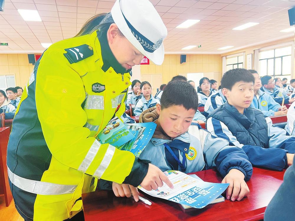 民警向學生講解交通安全知識。2月26日,臨潭縣公安局交警大隊組織民警走進臨潭縣回民中學,開展交通安全進校園宣傳活動。 新甘肅·甘肅法治報記者金凡裕攝
