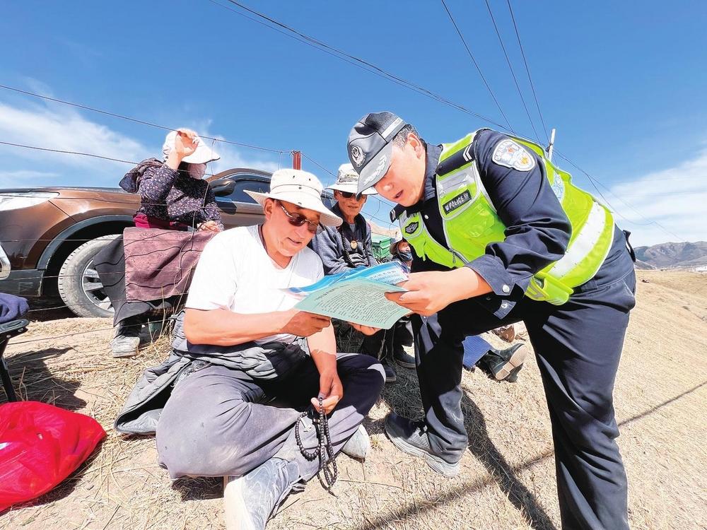 民輔警向群眾講解交通安全知識。近日,碌曲縣公安局交警大隊民輔警借助夏澤灘春季賽馬活動有利時機,開展“美麗鄉村行”交通安全巡回宣傳活動。 新甘肅·甘肅法治報記者金凡裕攝