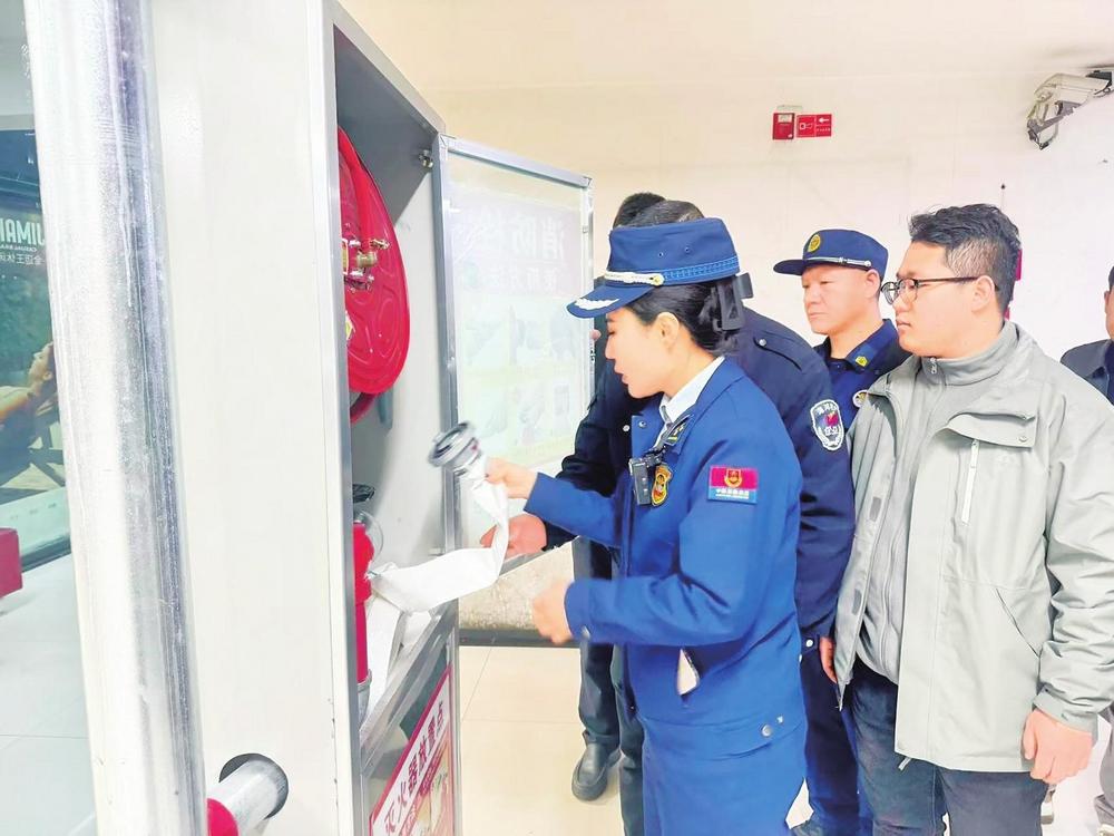 張文娟和同事檢查消防安全設施。城關區消防救援大隊供圖