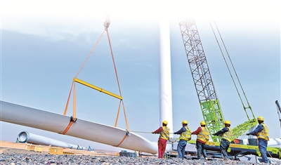 甘肅省高臺縣境內有戈壁荒漠2000多平方公里,近年來憑借風光資源優勢,發力新能源產業賽道。圖為該縣某新能源風力發電項目建設現場,工作人員正在安裝風力發電機。新華社發