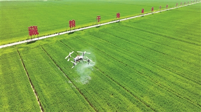 近年來,江蘇省宿遷市宿豫區多措并舉推動耕地保護責任落實,加快現代農業產業園核心區建設,保障糧食穩產增產。圖為近日,在該區新莊小麥單產提升示范區,無人機正在進行植保噴灑作業。朱冠軍 攝