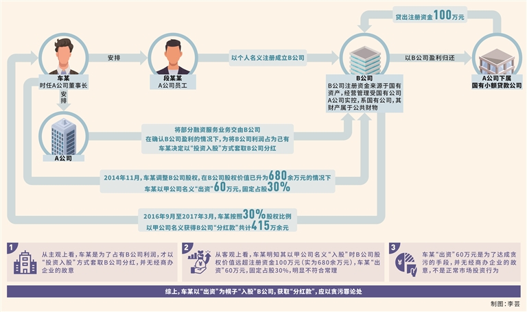 洪超蘭:本案中,從客觀上看,車某安排A公司相關(guān)業(yè)務(wù)部門將高新園區(qū)融資服務(wù)業(yè)務(wù)交由B公司經(jīng)營,且該業(yè)務(wù)由國有單位信用背書,利潤高、無風(fēng)險(xiǎn),在車某“出資”前B公司凈資產(chǎn)已遠(yuǎn)超注冊資本,車某以甲公司名義按照原出資額100萬元確定的股權(quán)比例“入股”B公司不符合正常投資行為,而是獲得國有公司確定性預(yù)期利益的手段。從主觀上看,根據(jù)車某供述及相關(guān)證人證言,車某見B公司的融資服務(wù)業(yè)務(wù)量在上升,幾乎沒有經(jīng)營成本,獲利空間巨大,便利用職務(wù)便利,以甲公司名義“投資入股”B公司,其主觀目的是為了獲取B公司的確定性預(yù)期收益,而非投資經(jīng)商辦企業(yè)。