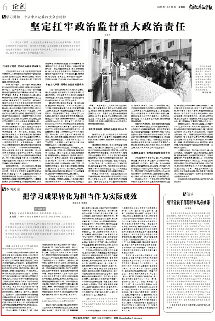 董兆生:理論學習是一項基礎性、長期性工程,必須著力構建長效機制,確保黨的創新理論真正內化于心、外化于行,轉化為正風肅紀反腐的強大動力和實際成效。持續深入抓好《習近平談治國理政》第五卷學習貫徹。學習好、貫徹好《習近平談治國理政》第五卷是紀檢監察機關的一項重大政治任務,要用好制度機制常態學,嚴格落實“第一議題”和“五學聯動”制度機制,通過理論學習中心組學習會議、“三會一課”等,推動學習入腦入心。依托“微課堂”“業務大比武”、黨校主體班次等平臺,創新運用集體研討學、專題培訓學、線上線下學、結合實踐學等方式,分級分類開展精準施訓。建立健全“課題調研—成果轉化”機制,帶著問題學、盯著問題研,形成指導實踐的制度措施。深化運用“知識測試+實踐評估+實績考核”的多維評價體系,推動將黨的創新理論蘊含的立場觀點方法轉化為提升辦案質效、加強紀檢監察隊伍建設、加強紀法教育培訓的具體實踐。(記者 楊雅玲)