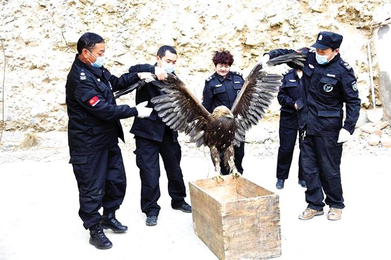 截至3月1日,經過管護站管護人員的精心喂養,金雕進食進水已經正常,身體恢復了健康,具備野外生存能力、符合放生的條件,最終放歸大自然。金雕屬鷹科、真雕屬的猛禽,是國家一級保護動物,以其敏捷有力地飛行而著稱,以大中型的鳥類和獸類為食。