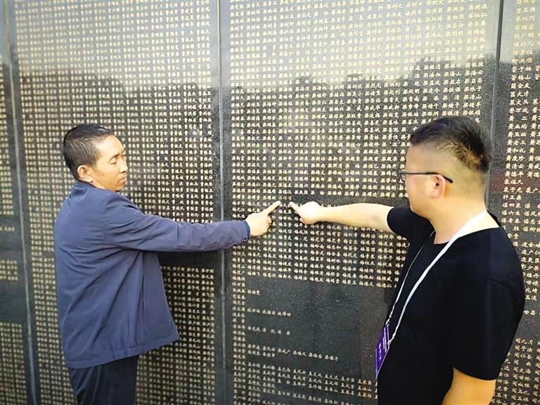 梁德保和梁潤全(右)在烈士陵園的英名墻上找到了親人的名字(甘肅省退役軍人事務廳 章小冬 供圖)