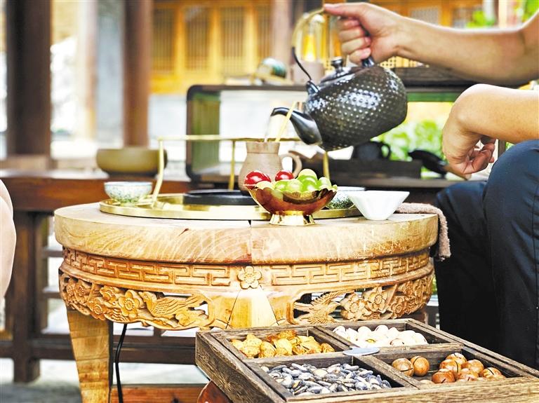 晚飯后是上座活躍期,一撥撥客人或隨意落座在古色古香的四合院長廊間,或穿堂入室端坐里間,聊天打趣侃侃而談,“搗”茶品茗各取所好,一天的疲乏與負累不知不覺間隨著那一刻輕溫慢煮的好時光,消散殆盡。