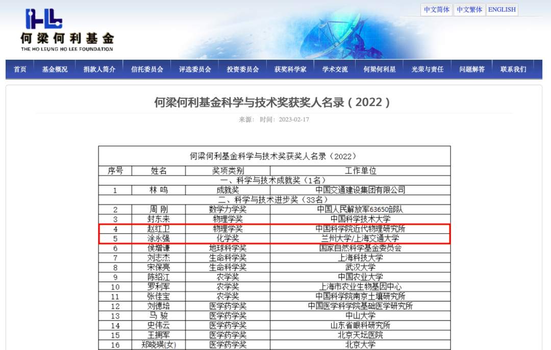 日前,何梁何利基金2021和2022年度頒獎大會在北京舉行,共授予112名杰出科技工作者。其中,中國科學院近代物理研究所趙紅衛、蘭州大學涂永強榮獲2022年度何梁何利基金科學與技術進步獎。