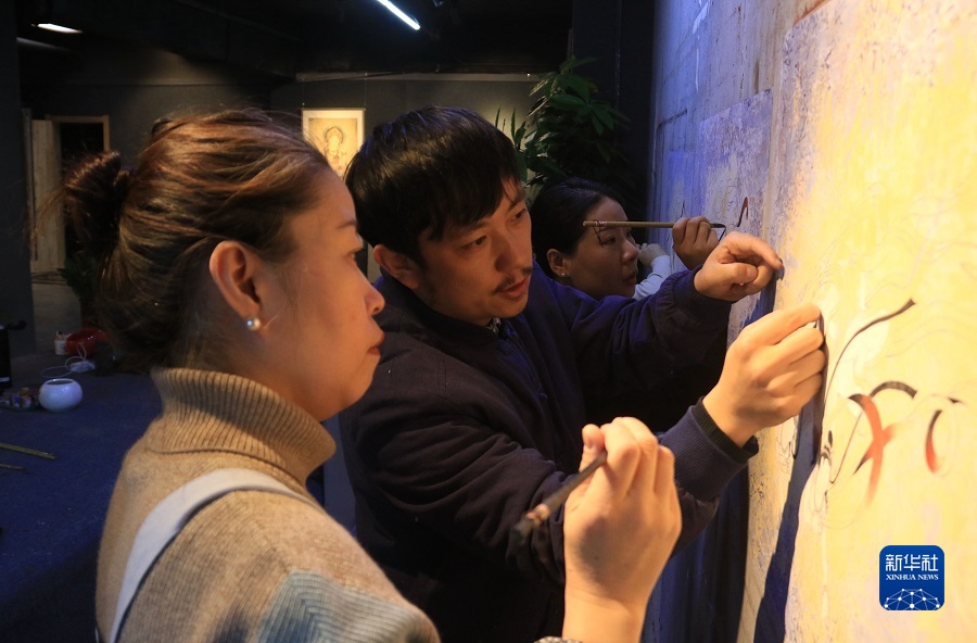 2月22日,在敦煌小鎮鳴沙書院,藝術工作者張杰龍(中)指導學員臨摹敦煌壁畫。