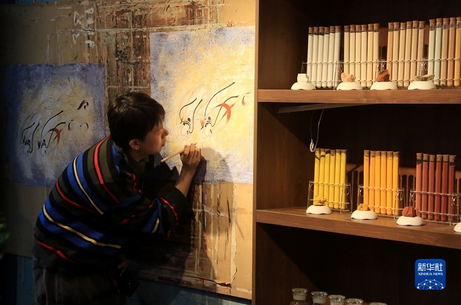 2月22日,在敦煌小鎮鳴沙書院,來自甘肅的學員朱俊峰學習敦煌壁畫臨摹技藝。