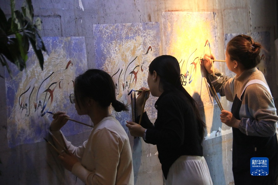2月22日,在敦煌小鎮鳴沙書院,藝術工作者張杰龍(中)指導學員進行顏料調色。