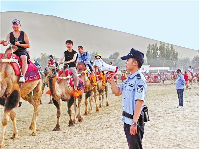 面對隨之而來的社會治安防控壓力,敦煌公安立足旅游特色,結合夏季治安打擊整治行動,精準布警、精細管控、精致服務,時刻踐行“民警就是導游,隊伍就是風景,管理就是服務,執法就是守護”的敦煌旅游警務理念,用“5A”警務服務“5A”景區。
