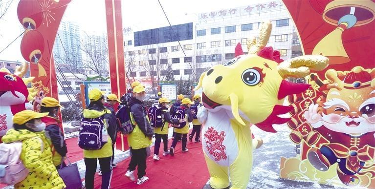 當日上午7時許,記者在蘭州市東郊學校看到,校門內兩邊擺放著兩條由數百個氣球組成的長龍。高年級段和低年級段的學生要穿越寫著“龍騰虎躍,前程似錦”的龍門,方可進入教室。同時,兩邊的老師,給每一位到校的學生發放小禮物。記者注意到,每個孩子都領到了一個小盲盒,里面裝著不同的文具。孩子們高興地揮舞著手中的盲盒,展示新春的快樂。