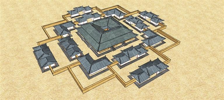 在中心夯土臺基四邊外約6.3米處平行分布有長方形附屬建筑,四角分布有曲尺形附屬建筑,對應位置的附屬建筑結構完全相同。長方形附屬建筑周圍有鵝卵石鋪就的散水環繞,其內有兩個相對的方形土臺,邊緣有柱洞,土臺外端中部連接夯土矮墻延伸至曲尺形建筑。四角曲尺形附屬建筑周圍亦有散水環繞,臺基邊緣有柱洞,曲尺形六邊各有一級空心磚踏步。臺基上有若干規律分布的扁平狀青石,推測應為室內立柱的礎石。曲尺形建筑的功能應該是連接兩邊的長方形建筑,同時還要兼顧外圍次一級附屬建筑的連接。各建筑散水周圍均鋪設回紋地磚,各臺基周邊散落著瓦礫堆積。