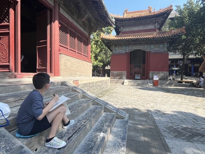 夜幕低垂,華燈初上,身著漢服的女孩徐行古跡之間。烈日當(dāng)頭,少年定坐在古老建筑旁安靜臨摹,筆下的雕梁畫棟多了樸拙意趣。“正定的古建筑很美,畫之前要細(xì)細(xì)觀察,但不能原封不動(dòng)地畫。畫得好,就很滿意、很開心。”今年12歲、從北京前來研學(xué)的米騰飛說。