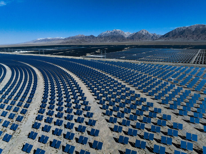 青海省海西蒙古族藏族自治州德令哈市光伏(光熱)產(chǎn)業(yè)園的光熱電站(2024年4月23日攝,無人機(jī)照片)。新華社記者 張龍 攝
