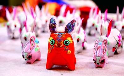 慶陽(yáng)香包兔元素?cái)[件。 盤(pán)小美攝