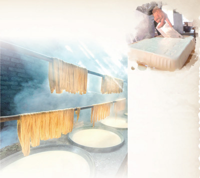 農家豆腐講究口感,個頭飽滿的土黃豆,清冽甘甜的山泉水,酸度適中的漿水湯,農家傳統的柴火灶,是必不可少的四件料。缺一樣,山野豆子就不能在清水中爆裂出植物的原香,沸騰的豆漿就開不出雪白的豆花兒。