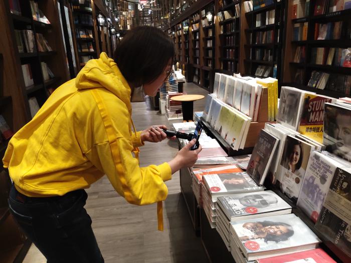 此前,鐘書閣靜安店店長原揚在直播“探店”。受訪者供圖
