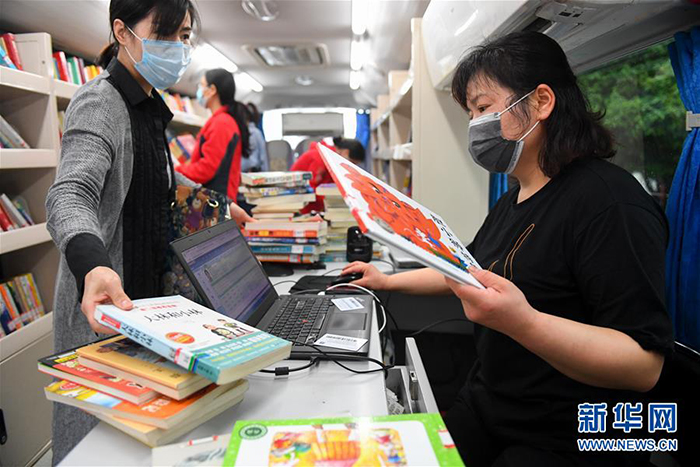 3月26日,在長沙岳麓區石嶺塘社區,家長和小朋友在流動圖書館里挑選書籍。 近日,在做好疫情防控工作的同時,長沙流動圖書館恢復運營。長沙流動圖書館是長沙圖書館的總分館流動服務項目之一,以大巴車為載體,每月定期到社區、學校、企業、工地等區域,為市民提供閱覽、咨詢、辦證、借書、還書等便捷化公共服務。 新華社記者 陳澤國 攝