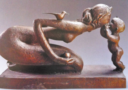 最后的廳,是一批中外馳名的雕塑代表作——從嬌小稚拙掌中把玩的小品到體量龐大高聳入云的巨構,無論隨形寫意、裝飾寫實,美林都在策劃、構成、調整、定型的繁復過程中,顯示出扎實的藝術功力與非凡的浪漫色彩。其中,龍、虎、馬、牛等動物系列,不僅延續了繪畫中獨有的造型風格,而且更凝重渾厚,更富裝飾情趣。與眾不同人見人愛的母子系列中,不論是精心呵護襁褓嬰兒的母親,匍匐草地引領學步的母親,牽手寶寶步入校園的母親,造型、肢體的夸張之奇變形之巧,感官、神態的風韻依依顧盼有情,讓人駐足良久再三流連……