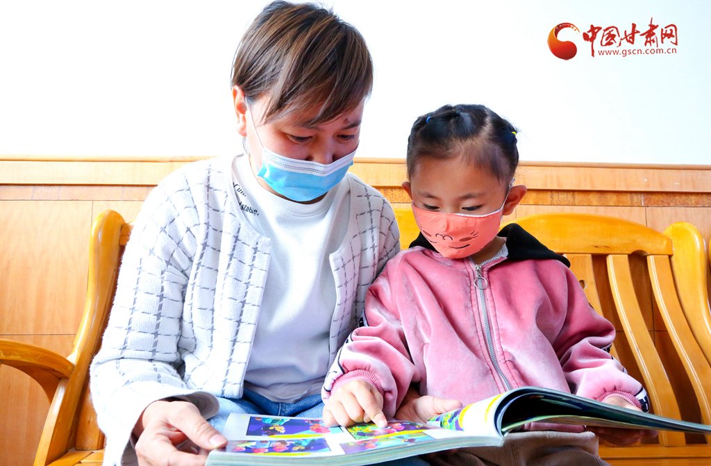 4月21日,甘肅張掖甘州區火車站街道下安村農家書屋內一名家長帶著孩子看書。
