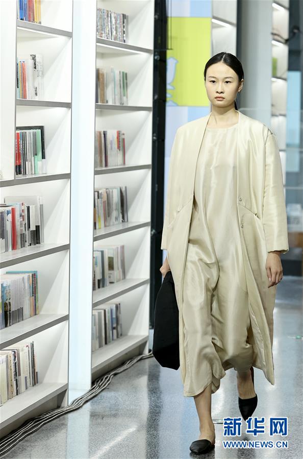 5月5日,模特在北京坊Pageone書店舉行的中國國際時裝周(2020/2021秋冬系列)“Beauté Comme Toi·姜月&CLEANFLOW·陳文熙”時裝秀上展示時裝。 新華社記者 陳建力 攝