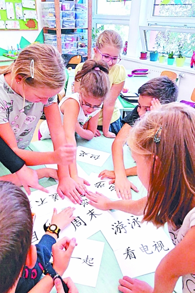 在匈牙利首都布達佩斯,匈中雙語學校的學生在課堂上復習漢語生詞。新華社發