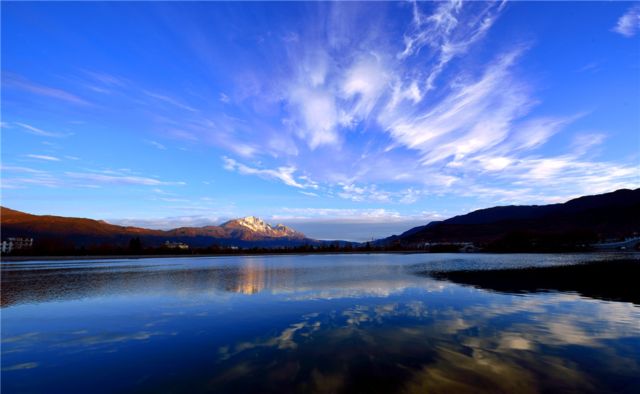 我是被亮光驚醒的。我和很多水從象山腳下的黑龍?zhí)睹俺鰜?lái)。咕咚一聲翻上水面。看見(jiàn)很多不同模樣的人。黑頭發(fā)的人,黃頭發(fā)的人。黑眼睛的人,藍(lán)眼睛的人。我看見(jiàn)了潭邊的亭臺(tái)樓閣。看見(jiàn)了花與樹(shù)。我還順著人們遠(yuǎn)眺的目光看見(jiàn)了玉龍雪山,晶瑩奪目矗立在藍(lán)天下面。潭水映照雪山,真讓人目眩神迷啊。人們?cè)跇蛏希诘躺希f(shuō)著不同的語(yǔ)言。在不同的語(yǔ)言里,都有那個(gè)詞頻頻出現(xiàn):麗江,麗江。這時(shí)的麗江已經(jīng)是一座很大的城了。城里也不是只有最初筑城的納西人了。如今全中國(guó)全世界的人都要來(lái)麗江,看納西古城的四方街,看玉龍雪山。