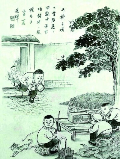 觀賞這一套畫作,好像打開了一整座童年生活的博物館,館藏格外豐富和詳盡,玩耍、上學、家務、農事、年節,林林總總,堪稱極大程度地再現了童年生活的樣態形貌。不少畫面還具有頗為鮮明的時代特征,像《派活兒》《滅蝗蟲》《地震棚》《送新兵》《備戰麥收》《出村看電影》等等,是一份那個年代農村社會生活的原生態寫照,文獻的價值寄寓在生動的畫面中。